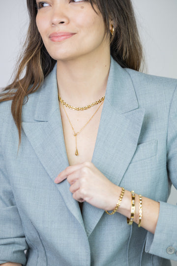 Our jewelry is hand made out of stainless steel and 18k gold plated. It is water resistant and hypo allergenic.